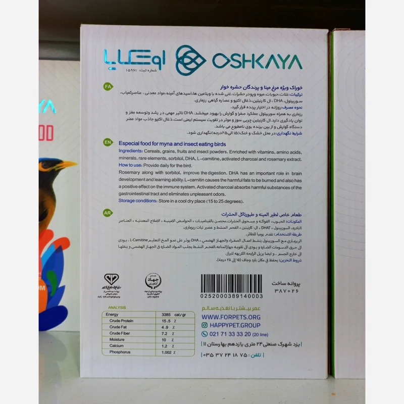 خوراک ویژه مرغ مینا و پرندگان حشره خوار محصولی از اوشکایا Oshkaya حاوی انواع غلات، حبوبات، میوه و پودر حشرات، غنی شده با ویتامین ها، اسیدهای آمینه، مواد معدنی، عناصر کمیاب، ذغال اکتیو و...