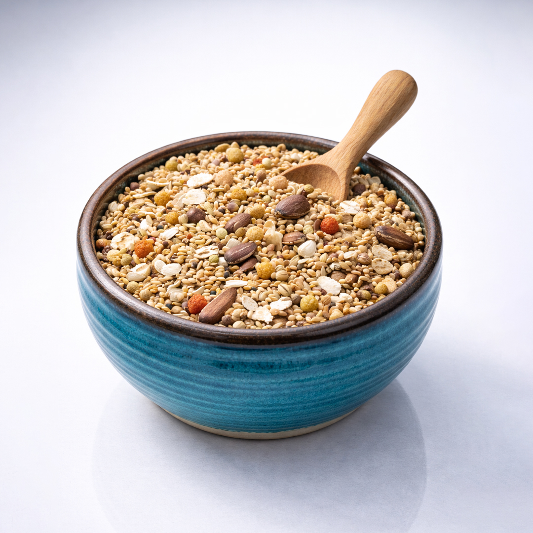 ترکیب این اجزا با نسبتهای اصولی و کنترلشده انجام شده تا از مصرف بیشازحد بذرهای چرب جلوگیری شود و تعادل تغذیهای حفظ گردد.